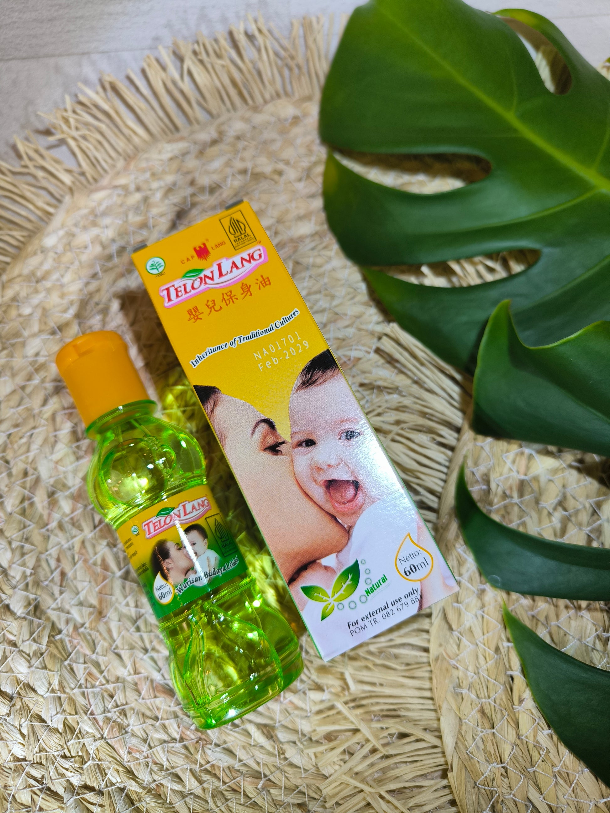 Minyak Telon is een geliefde traditionele Indonesische olie die al generaties lang wordt gebruikt om baby’s en jonge kinderen te verzorgen en te beschermen. De naam “Telon” komt van het Indonesische woord telu, wat “drie” betekent — verwijzend naar de drie hoofdingrediënten: venkelolie (minyak adas), eucalyptusolie (minyak kayu putih) en kokosolie (minyak kelapa).