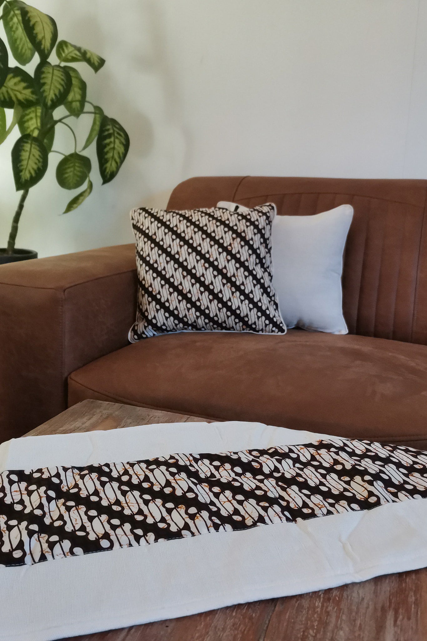 Mooie tafelloper met truntum motief. Fleur je interieur op met deze geweldige loper met traditionele bedrukking. Redelijk drukke bedrukking van bloemetjes, bedrukt met zwart en bruin op wit.
