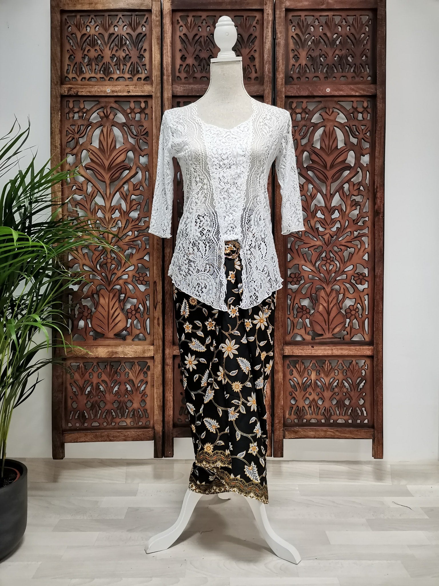 Zwart witte wikkelrok met bloemen. Verkrijgbaar in twee kleuren. Op de Gold versie staan bruine melati bloemen met gouden accenten en op de Silver versie witte melati bloemen met kleine gouden accenten. De wikkelrok is eenvoudig te knopen en valt erg mooi.
